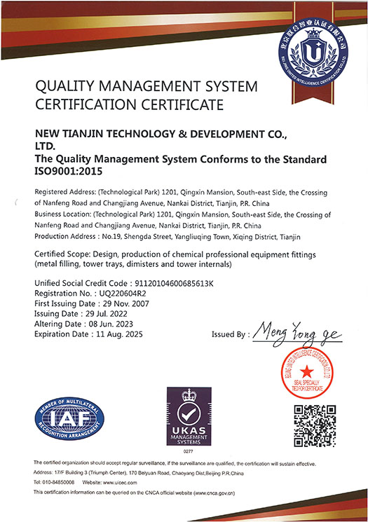天津市新天進科技開發(fā)有限公司(簡稱新天進公司)主要從事化工分離工程中的工藝流程及傳質(zhì)設備(填料塔、板式塔、除霧器及其它塔內(nèi)件)的研究、開發(fā)、設計、制造、安裝、調(diào)試和服務,以及精細化學品、催化劑的研制和開發(fā)。 新天進公司在同行業(yè)率先通過ISO9001質(zhì)量體系認證。
