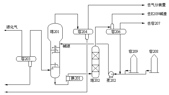 裝置流程: 來自#1、#2催化裝置的液化氣在液化氣脫硫塔中用MDEA(N-甲基二乙醇胺)溶液除去H2S,然后進(jìn)入液化氣抽提塔201脫硫醇,塔201用溶解有催化劑的堿液進(jìn)行脫硫醇,脫硫醇后液化石油氣經(jīng)水洗罐(容204)水洗除去微量堿,作為精制產(chǎn)品送去氣分裝置作原料。抽提塔底堿液進(jìn)入氧化塔(塔202)用空氣氧化再生。