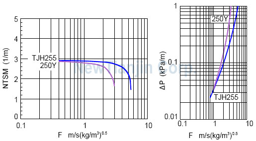 3. TJH型填料的壓降與效率 圖2給出了250Y板波紋填料、TJH255填料在乙苯/氯苯物系下的性能曲線。 由圖2對比實驗結(jié)果可以看出,TJH型填料與普通規(guī)整填料相比在低負(fù)荷下,效率與壓降基本相當(dāng);在較高負(fù)荷下,脈沖規(guī)整填料效率明顯高于普通規(guī)整填料,壓降明顯低于普通規(guī)整填料,即TJH型填料在提高通量的同時提高了填料效率。